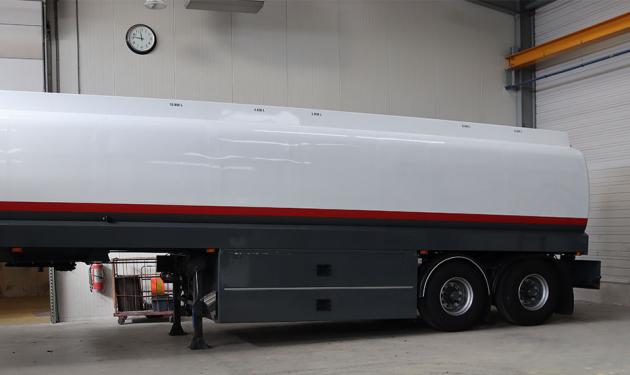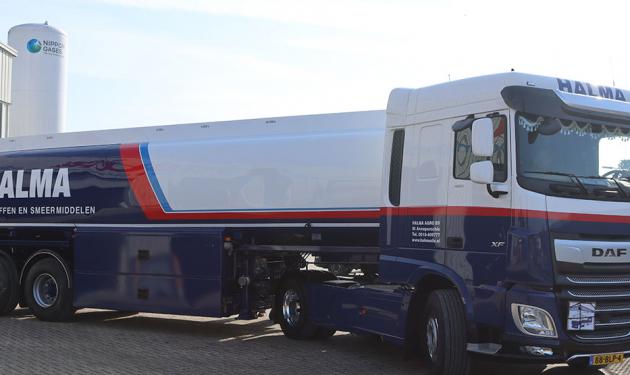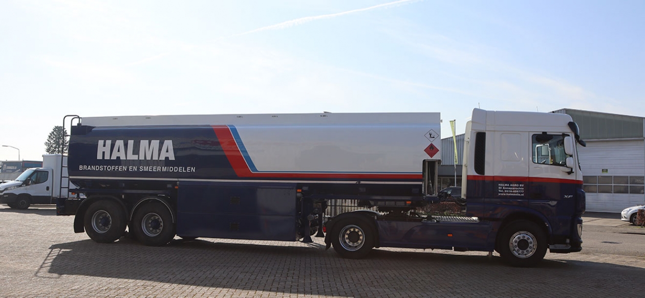 Halma heeft een tankoplegger aangeschaft die na een grondige revisie in een andere kleur diende te worden gespoten. Van grijs/wit naar wit/blauw met een aantal roze en lichtblauwe biezen. De oplegger diende ook te worden voorzien van reclame en reflecterende striping op de zijkanten en de achterkant.